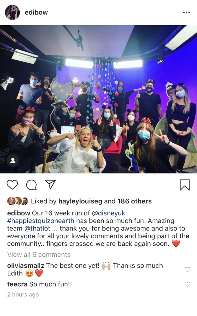 Disney partnered with Edith Bowman to create a magical weekly event that would lift spirits and bring joy. I acted as co-producer, techincal producer and director, meaning I would conduct rehearsals, help shape creative, attend client facing meetings and connect the remote streams. When we were able to move into a studio I would also floor manage the production due to limited crew size.